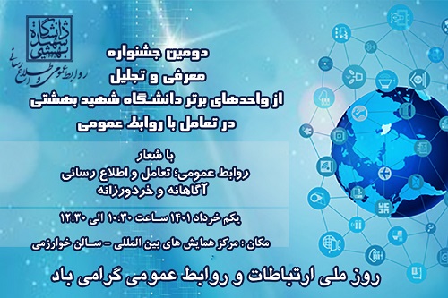 «دومین جشنــواره معرفـی و تجلیــل از واحدهـای برتـر دانشگـاه شهیـد بهشتـی در تعامل با روابط عمومی» یکشنبه اول خرداد 1401  در سالن خوارزمی مرکز همایش‌های بین‌المللی برگزار می‌شود.