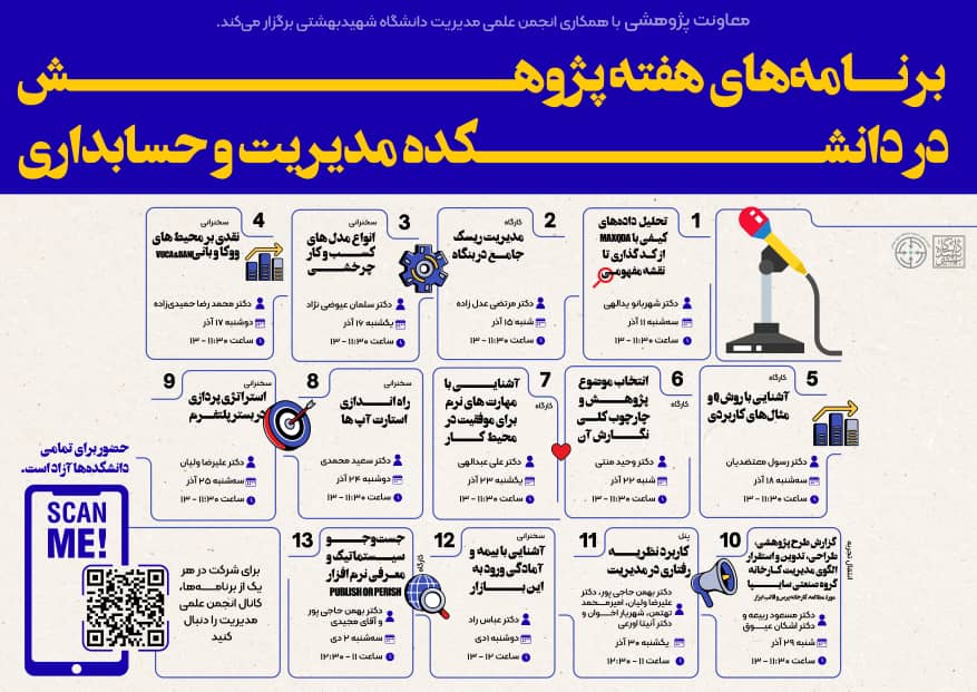 برنامههای هفته پژوهش در دانشکده مدیریت و حسابداری 14 بازدید print share 11-2 آذر-دی معاونت پژوهشی با همکاری انجمن علمی مدیریت دانشگاه شهید بهشتی برگزار میکند. نظرات صفحه