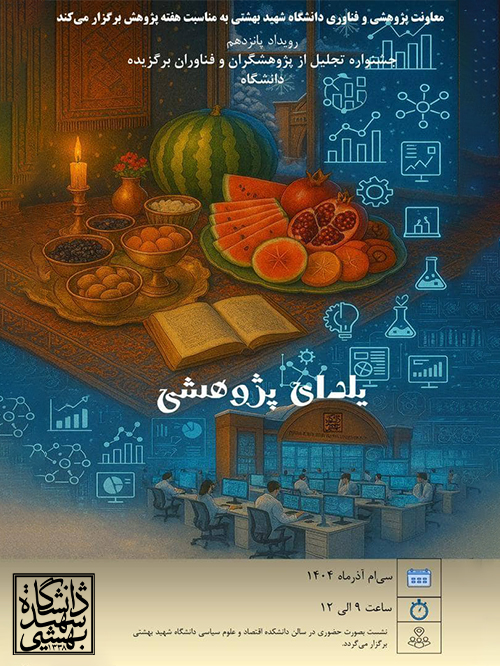 برگزاری مراسم تجلیل از پژوهشگران برگزیده دانشگاه شهید بهشتی و رویداد «یلدای پژوهشی» 45 بازدید print share 30 آذر به مناسبت گرامیداشت هفته پژوهش و فناوری، معاونت پژوهشی و فناوری دانشگاه شهید بهشتی...